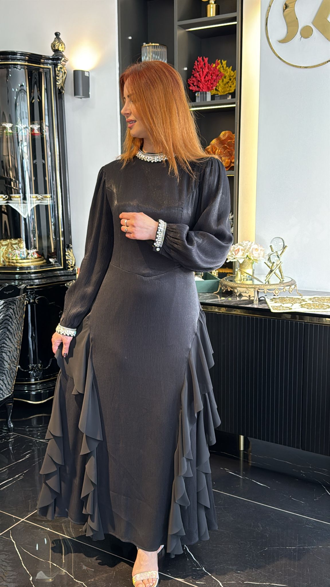 Sıradan bir siyah elbiseden çok daha fazlası! Yanlardaki kat kat volan detaylarıyla hareket kazanan, yakasındaki ve manşetlerindeki kristal işlemelerle mücevher şıklığı sunan bu parça, gardırobunuzun en özel üyesi olmaya aday.