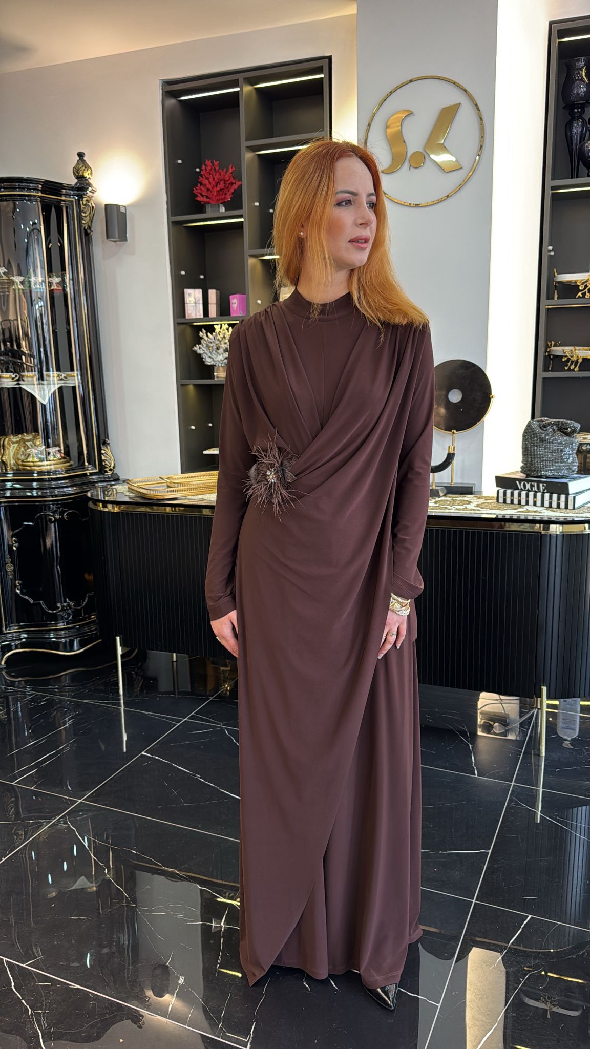 ahvenin en asil tonuyla tanışın. 🤎 Hem davetlerde hem de özel akşam yemeklerinde tüm bakışları üzerinizde toplayacak drapeli kesim ve tüy detayıyla zarafeti yeniden tanımlıyoruz. Çabasız şıklık arayanlar için sınırlı sayıda stoklarda! ✨”
