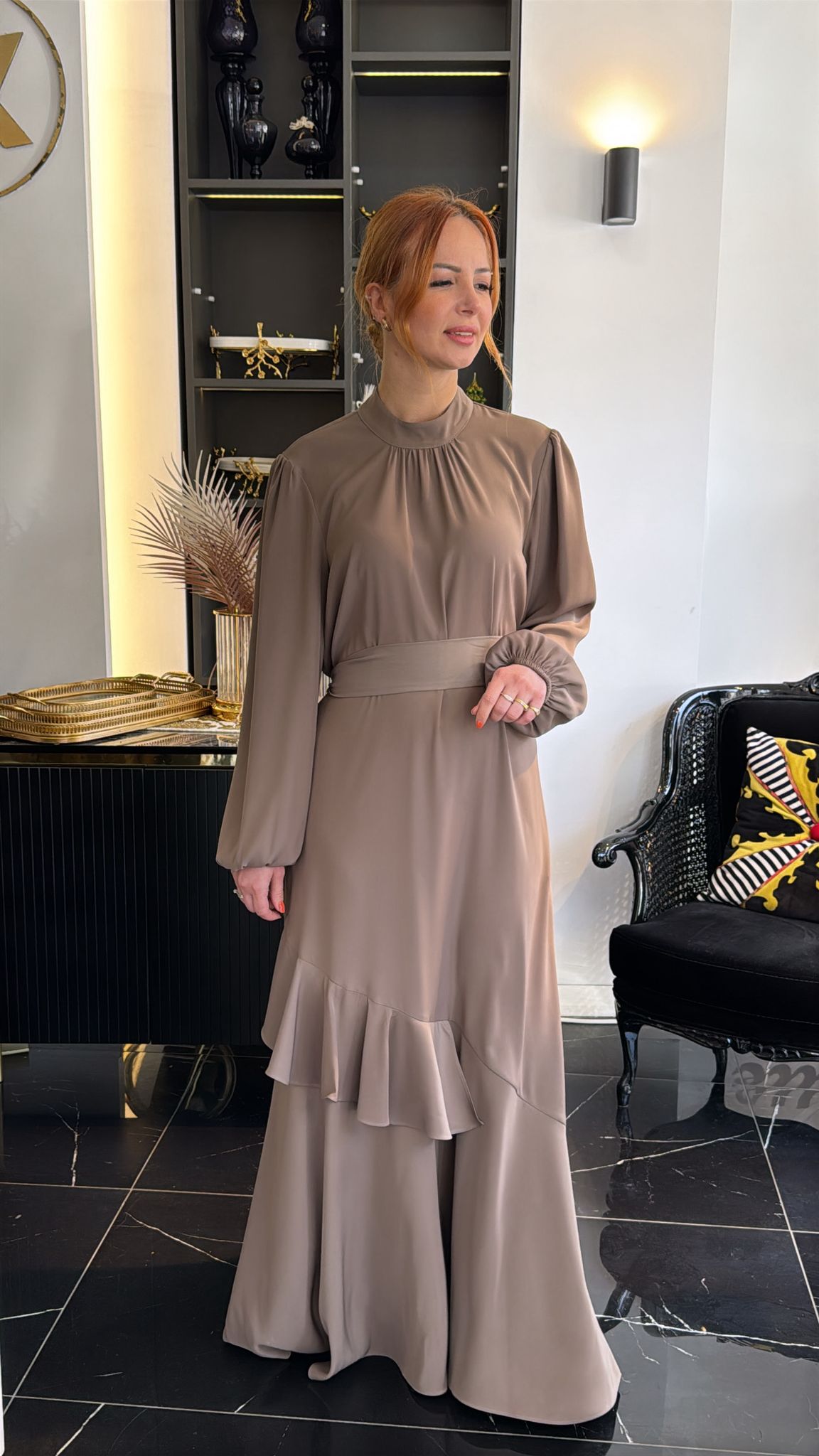 • Elbisenin vizon tonu sarı altın (gold) küpe ve yüzüklerle mükemmel uyum sağlar.
