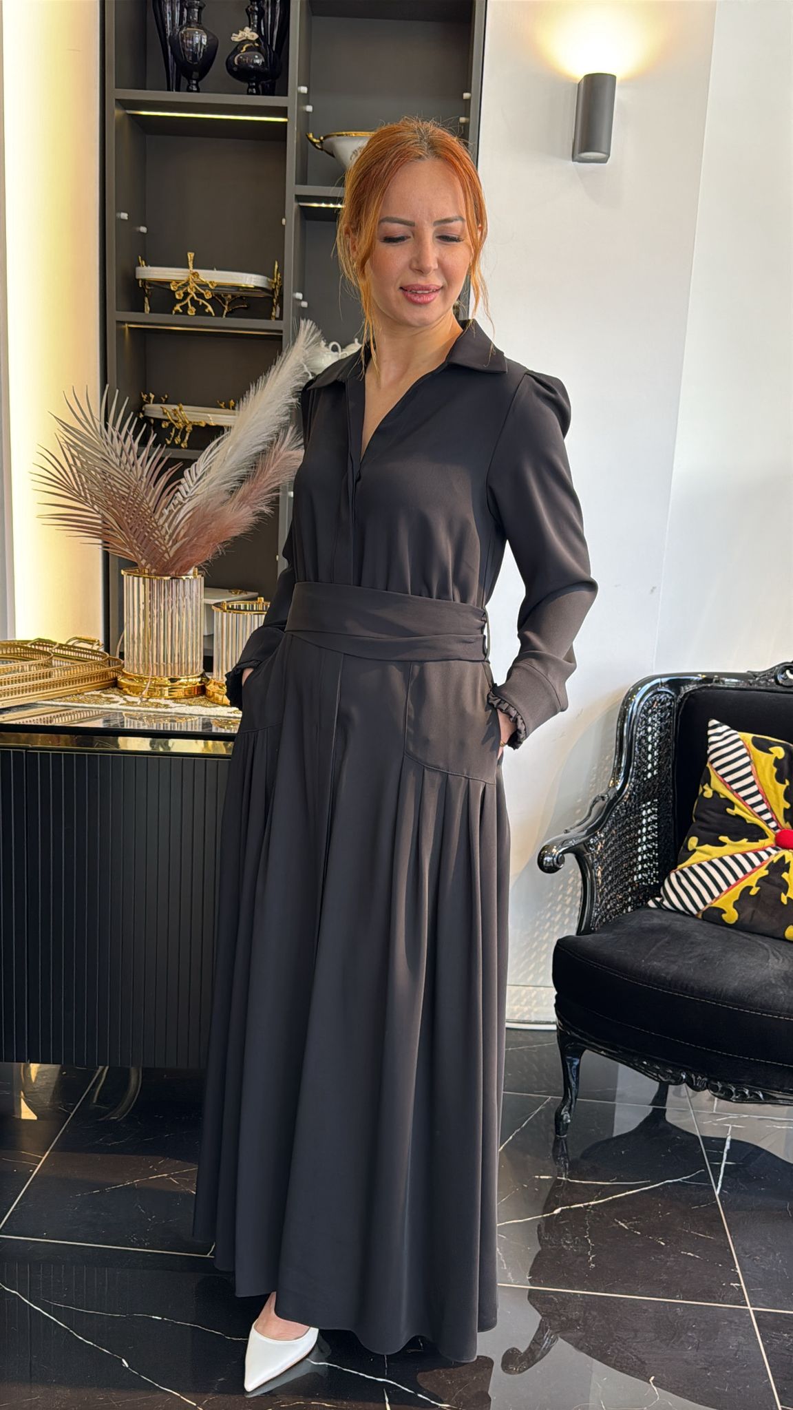 Bel Vurgusu: Geniş kemer/kuşak detayı beli ince gösterirken, pileli etek geçişiyle vücuda form kazandırır.