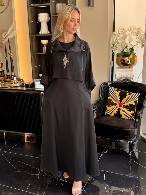 - Benzersiz Katmanlı Tasarım: Üst kısımda bulunan kısa, bol kesim katman, elbiseye dinamik bir hava katarken, yaka ve manşetlerdeki parlak şerit detayları modern ve lüks bir dokunuş sağlar.