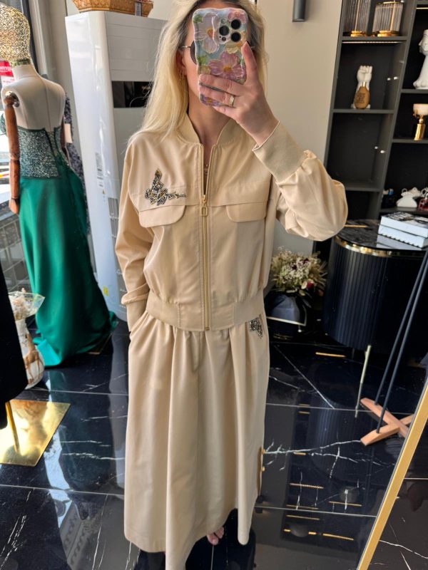Bu takımın kumaşı, hafif ve dökümlü yapısıyla gün boyu rahatlık sunarken, parlak ve şık duruşuyla da göz dolduruyor. Üzerindeki işlemeler, takımın ana rengi olan bejle mükemmel bir uyum sağlayarak ürüne sofistike bir dokunuş katıyor. Bu detaylı işçilik, ürünün kalitesini ve özgün tasarımını öne çıkarıyor. ürünün giyilmiş  Hali sayfamızda mevcuttur