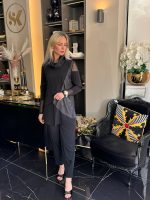 • Maksimum Konforlu Alt Parça: Üst parçanın iddialı görünümünü dengeleyen klasik kesim, rahat pantolon (muhtemelen havuç veya dar paça), hareket özgürlüğünüzü kısıtlamadan şık bir duruş sergilemenizi sağlar. Esnek kumaşı sayesinde gün boyu konfor vadediyor.