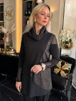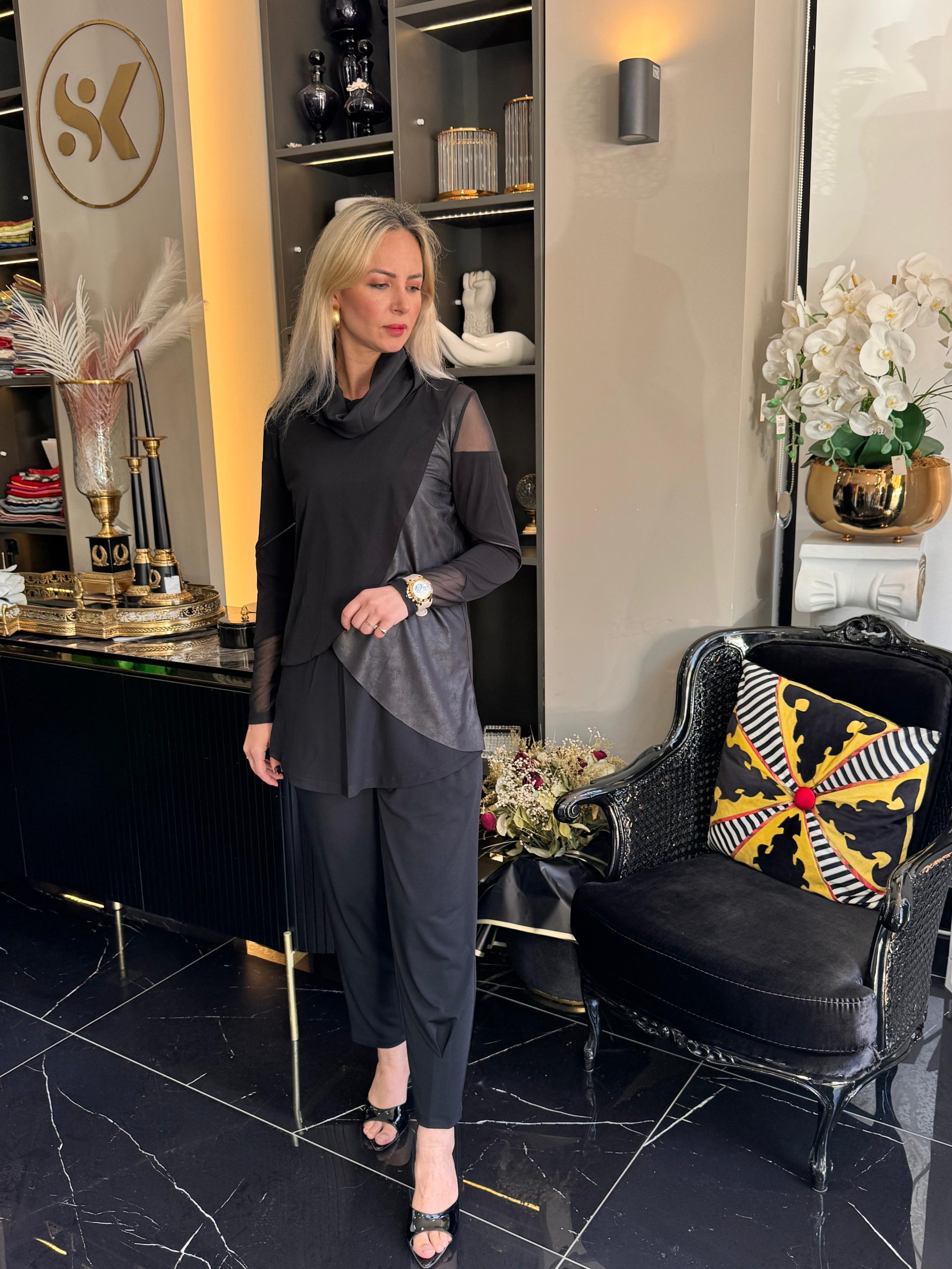 • Çarpıcı Üst Parça: Bluzdaki farklı doku ve katmanların birleşimi, sıradanlığa meydan okuyor. Suni deriyi andıran köşeli panel, transparan tül detaylar ve zarif şal yaka (veya balıkçı yaka) tasarımı, anında dikkat çeken sofistike bir silüet yaratıyor.
