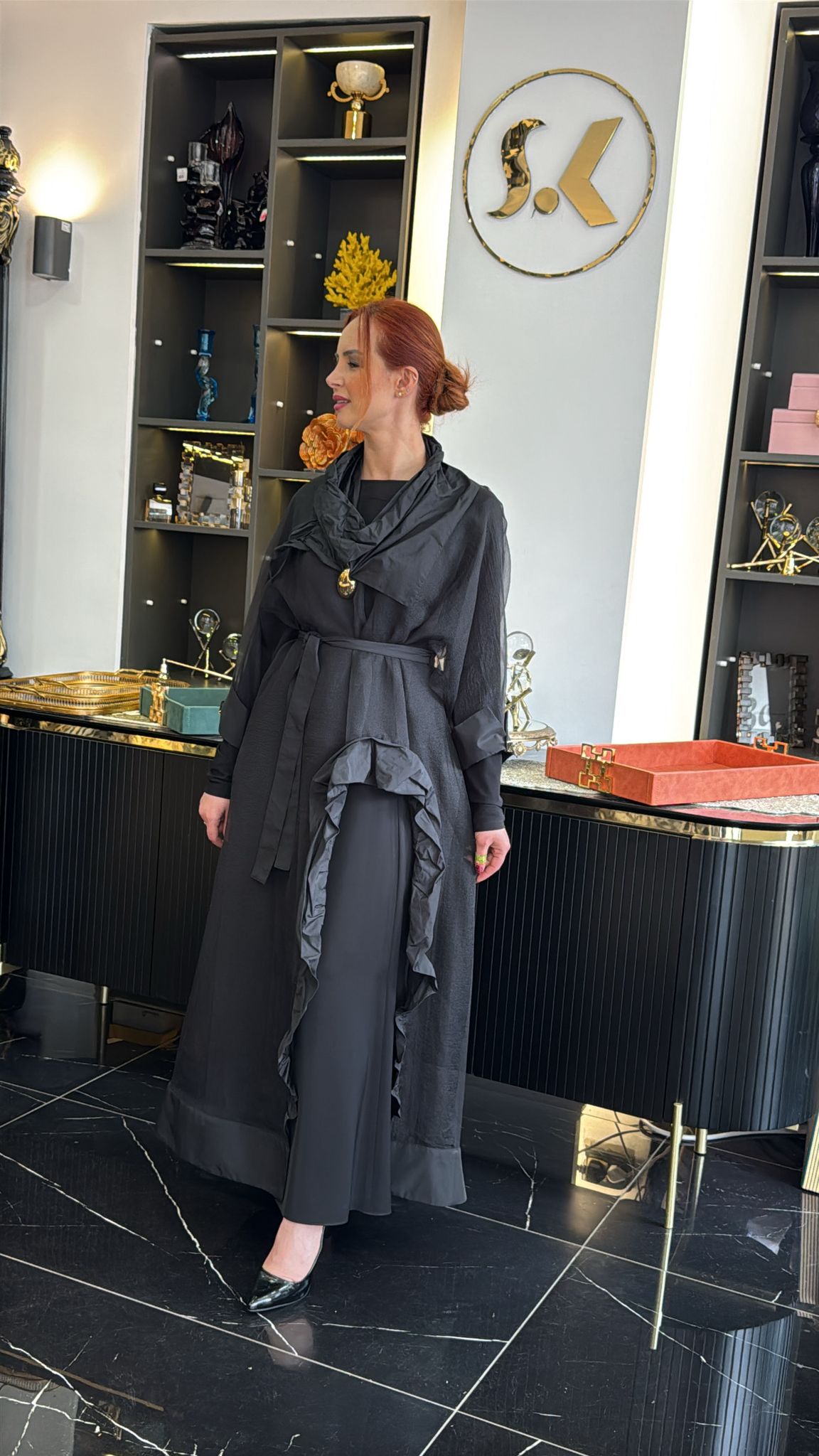• Kombin Önerisi: Müşterinize, görseldeki gibi şık bir topuklu ayakkabı ve gold detaylı aksesuarlarla gece davetlerine, daha sade parçalarla ise şık akşam yemeklerine gidebileceğini hatırlatın.
