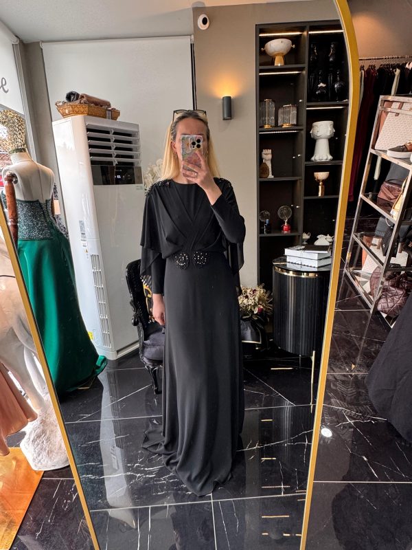Omuzlardan zarifçe sarkan ve kolları örten pelerin kesimi, elbiseye anında bir ihtişam ve sofistike bir hava katıyor. Her adımınızda size eşlik eden bu detayla bakışları üzerinize çekin.