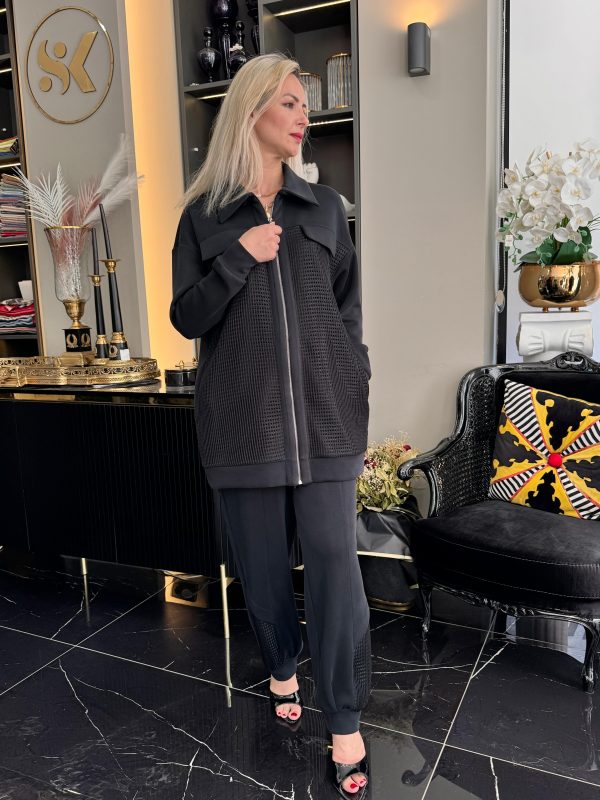 - Göz Alıcı Tasarım: Klasik siyahın gücünü, modern detaylarla birleştiren bu takım, her ortamda fark yaratmanızı sağlayacak. Özellikle ceketin ön kısmındaki dokulu, file benzeri detay ve parlak fermuar, tasarıma dinamik bir hava katıyor.