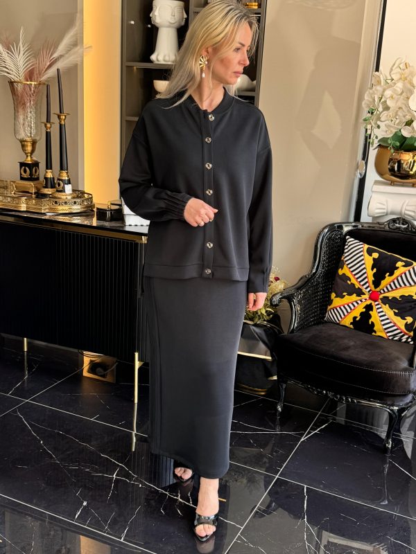 - Modern Düğme Detayı: Üst parçadaki şık ve parlak düğmeler, takıma modern bir hava katarken, ceket/hırka görünümündeki bu üstü bir ceket gibi veya kapalı olarak kullanma imkanı sunar.